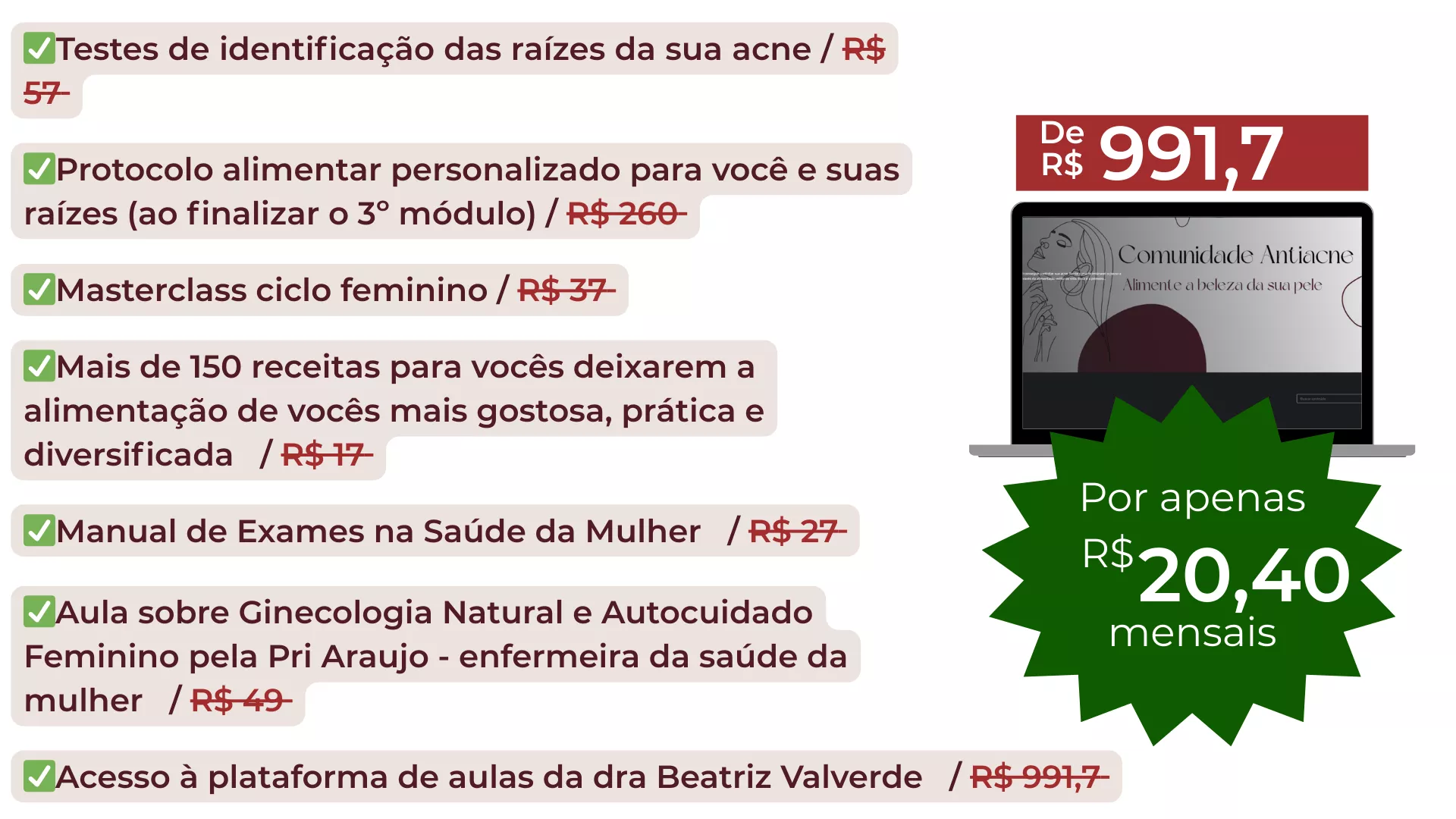 Você vai aprender os 4 pilares para acabar com sua acne, desde a identificação das origens da sua acne até as estratégias nutricionais específicas para cada caso.